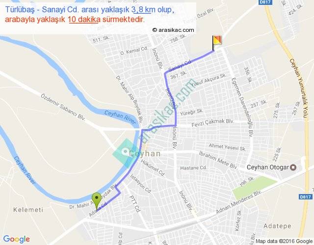 Türlübaş - Sanayi Cd. arası yaklaşık olarak 90 km/h ile yukarıda belirtilen sürede olup, iki yerin kuş uçuşu uzaklığı (mesafesi) 3'dir. Yolculuk otobüsle 13 dakika sürmektedir.
