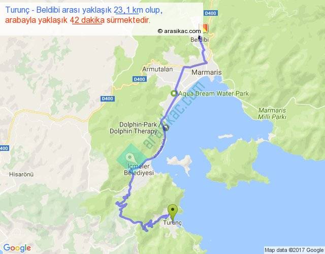 Turunç - Beldibi arası yaklaşık olarak 90 km/h ile yukarıda belirtilen sürede olup, iki yerin kuş uçuşu uzaklığı (mesafesi) 11'dir. Yolculuk otobüsle 54 dakika sürmektedir.