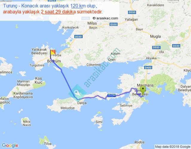 Turunç - Konacık arası yaklaşık olarak 90 km/h ile yukarıda belirtilen sürede olup, iki yerin kuş uçuşu uzaklığı (mesafesi) 81'dir. Yolculuk otobüsle 3 saat 13 dakika sürmektedir.
