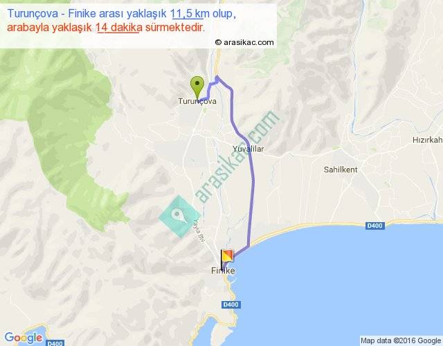 Turunçova - Finike arası yaklaşık olarak 90 km/h ile yukarıda belirtilen sürede olup, iki yerin kuş uçuşu uzaklığı (mesafesi) 8'dir. Yolculuk otobüsle 18 dakika sürmektedir.
