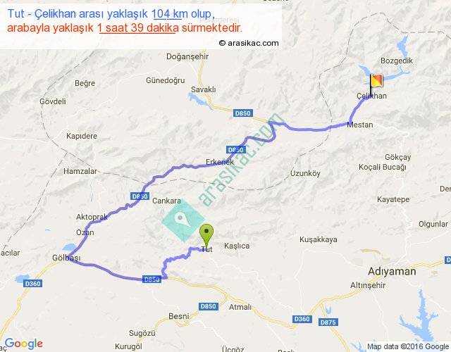 Tut - Çelikhan arası yaklaşık olarak 90 km/h ile yukarıda belirtilen sürede olup, iki yerin kuş uçuşu uzaklığı (mesafesi) 38'dir. Yolculuk otobüsle 2 saat 8 dakika sürmektedir.