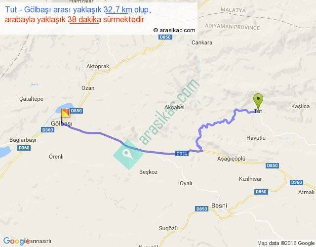 Tut - Gölbaşı arası yaklaşık olarak 90 km/h ile yukarıda belirtilen sürede olup, iki yerin kuş uçuşu uzaklığı (mesafesi) 24'dir. Yolculuk otobüsle 49 dakika sürmektedir.