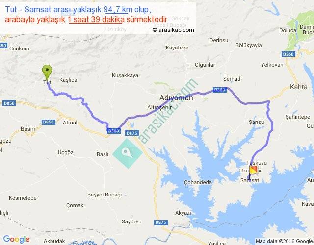 Tut - Samsat arası yaklaşık olarak 90 km/h ile yukarıda belirtilen sürede olup, iki yerin kuş uçuşu uzaklığı (mesafesi) 55'dir. Yolculuk otobüsle 2 saat 8 dakika sürmektedir.