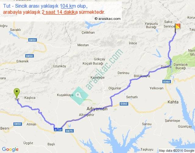 Tut - Sincik arası yaklaşık olarak 90 km/h ile yukarıda belirtilen sürede olup, iki yerin kuş uçuşu uzaklığı (mesafesi) 68'dir. Yolculuk otobüsle 2 saat 54 dakika sürmektedir.