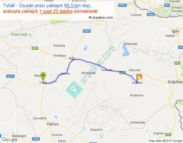 Tutak - Diyadin arası yaklaşık olarak 90 km/h ile yukarıda belirtilen sürede olup, iki yerin kuş uçuşu uzaklığı (mesafesi) 77'dir. Yolculuk otobüsle 1 saat 47 dakika sürmektedir.