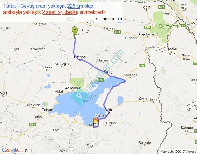 Tutak - Gevaş arası yaklaşık olarak 90 km/h ile yukarıda belirtilen sürede olup, iki yerin kuş uçuşu uzaklığı (mesafesi) 141'dir. Yolculuk otobüsle 3 saat 46 dakika sürmektedir.