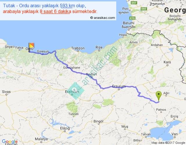 Tutak - Ordu arası yaklaşık olarak 90 km/h ile yukarıda belirtilen sürede olup, iki yerin kuş uçuşu uzaklığı (mesafesi) 442'dir. Eğer belirtilen yerler arasında uçak seferi var ise bu süre uçakla 40 dakika'ya kadar düşebilir. Yolculuk otobüsle 10 saat 31 dakika sürmektedir.