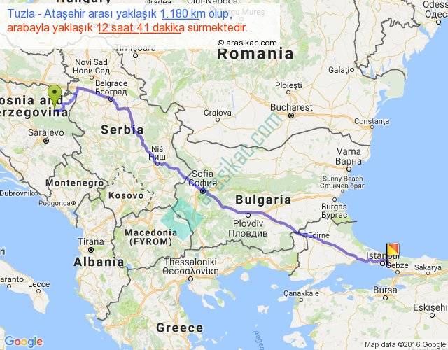 Tuzla - Ataşehir arası yaklaşık olarak 90 km/h ile yukarıda belirtilen sürede olup, iki yerin kuş uçuşu uzaklığı (mesafesi) 934'dir. Eğer belirtilen yerler arasında uçak seferi var ise bu süre uçakla 1 saat 26 dakika'ya kadar düşebilir. Yolculuk otobüsle 16 saat 29 dakika sürmektedir.