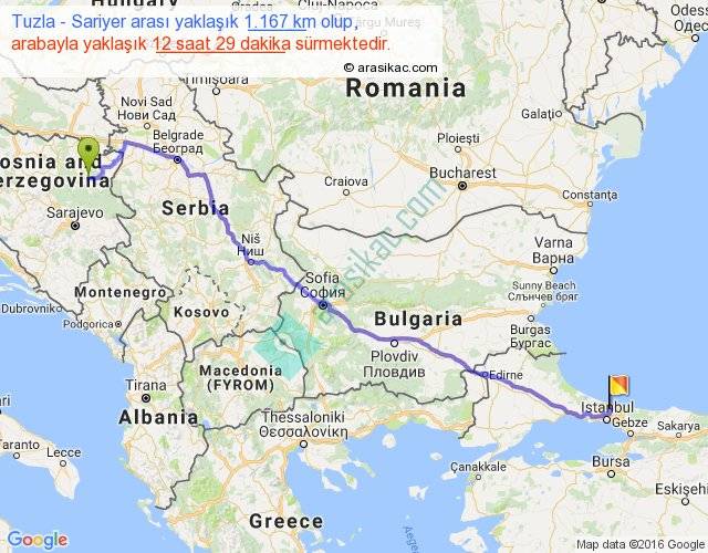 Tuzla - Sariyer arası yaklaşık olarak 90 km/h ile yukarıda belirtilen sürede olup, iki yerin kuş uçuşu uzaklığı (mesafesi) 919'dir. Eğer belirtilen yerler arasında uçak seferi var ise bu süre uçakla 1 saat 24 dakika'ya kadar düşebilir. Yolculuk otobüsle 16 saat 13 dakika sürmektedir.