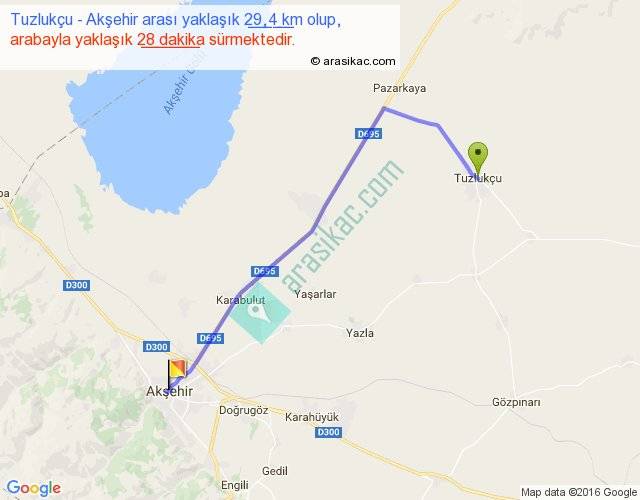 Tuzlukçu - Akşehir arası yaklaşık olarak 90 km/h ile yukarıda belirtilen sürede olup, iki yerin kuş uçuşu uzaklığı (mesafesi) 22'dir. Yolculuk otobüsle 36 dakika sürmektedir.