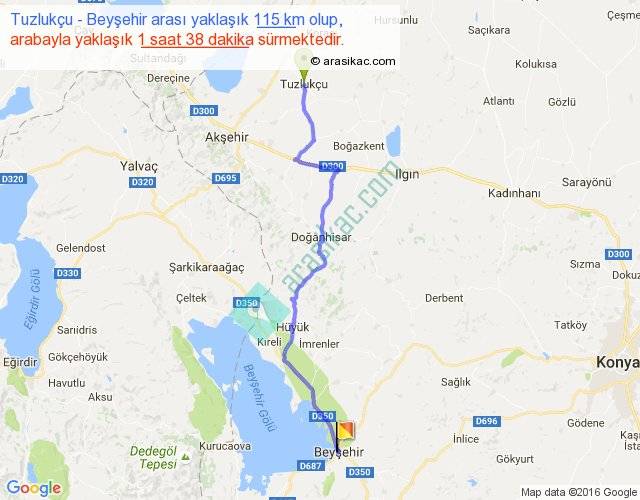 Tuzlukçu - Beyşehir arası yaklaşık olarak 90 km/h ile yukarıda belirtilen sürede olup, iki yerin kuş uçuşu uzaklığı (mesafesi) 88'dir. Yolculuk otobüsle 2 saat 7 dakika sürmektedir.