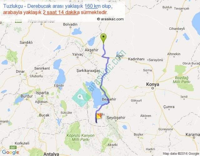Tuzlukçu - Derebucak arası yaklaşık olarak 90 km/h ile yukarıda belirtilen sürede olup, iki yerin kuş uçuşu uzaklığı (mesafesi) 120'dir. Yolculuk otobüsle 2 saat 54 dakika sürmektedir.