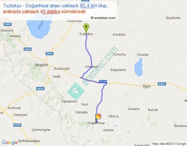 Tuzlukçu - Doğanhisar arası yaklaşık olarak 90 km/h ile yukarıda belirtilen sürede olup, iki yerin kuş uçuşu uzaklığı (mesafesi) 37'dir. Yolculuk otobüsle 58 dakika sürmektedir.