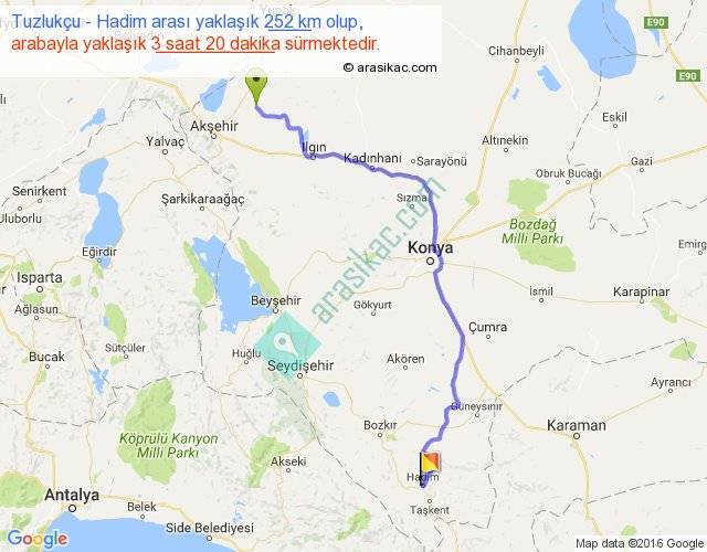 Tuzlukçu - Hadim arası yaklaşık olarak 90 km/h ile yukarıda belirtilen sürede olup, iki yerin kuş uçuşu uzaklığı (mesafesi) 180'dir. Yolculuk otobüsle 4 saat 20 dakika sürmektedir.