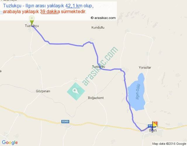 Tuzlukçu - Ilgın arası yaklaşık olarak 90 km/h ile yukarıda belirtilen sürede olup, iki yerin kuş uçuşu uzaklığı (mesafesi) 33'dir. Yolculuk otobüsle 50 dakika sürmektedir.