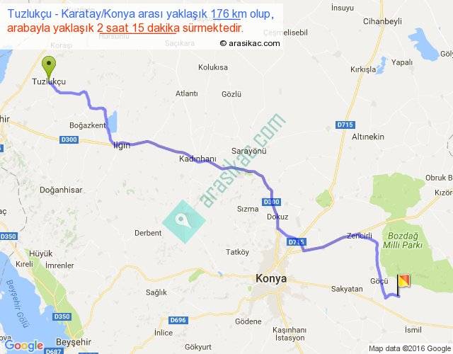 Tuzlukçu - Karatay Konya arası yaklaşık olarak 90 km/h ile yukarıda belirtilen sürede olup, iki yerin kuş uçuşu uzaklığı (mesafesi) 138'dir. Yolculuk otobüsle 2 saat 55 dakika sürmektedir.