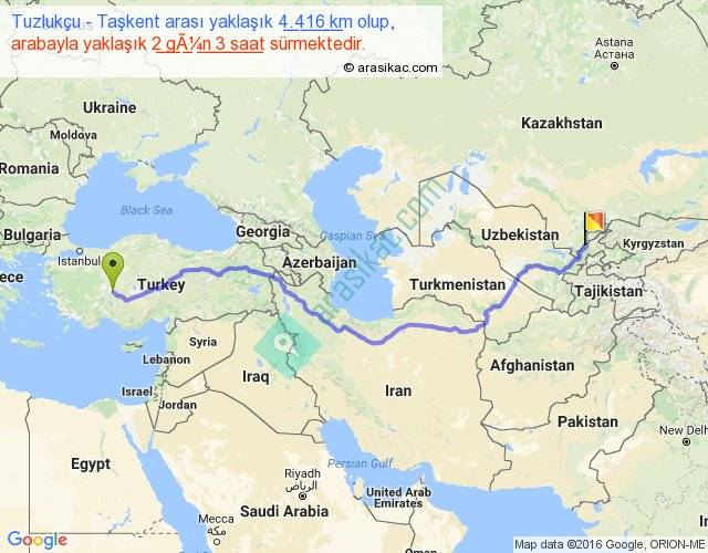 Tuzlukçu - Taşkent arası yaklaşık olarak 90 km/h ile yukarıda belirtilen sürede olup, iki yerin kuş uçuşu uzaklığı (mesafesi) 3180'dir. Eğer belirtilen yerler arasında uçak seferi var ise bu süre uçakla 4 saat 53 dakika'ya kadar düşebilir. Yolculuk otobüsle 2 gün 18 saat sürmektedir.