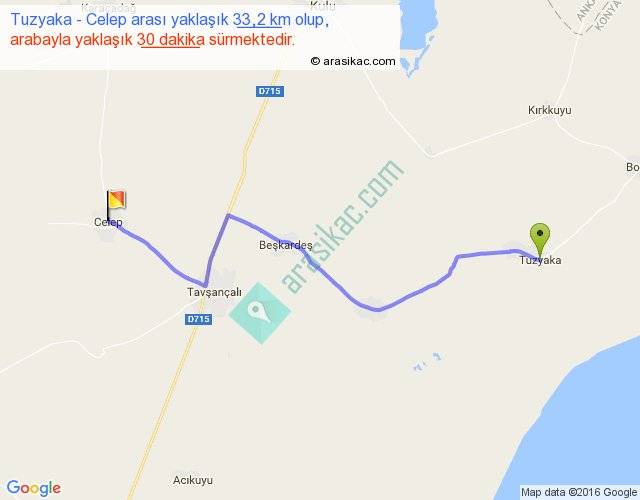 Tuzyaka - Celep arası yaklaşık olarak 90 km/h ile yukarıda belirtilen sürede olup, iki yerin kuş uçuşu uzaklığı (mesafesi) 26'dir. Yolculuk otobüsle 39 dakika sürmektedir.