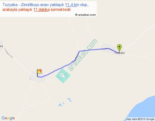 Tuzyaka - Zincirlikuyu arası yaklaşık olarak 90 km/h ile yukarıda belirtilen sürede olup, iki yerin kuş uçuşu uzaklığı (mesafesi) 10'dir. Yolculuk otobüsle 14 dakika sürmektedir.
