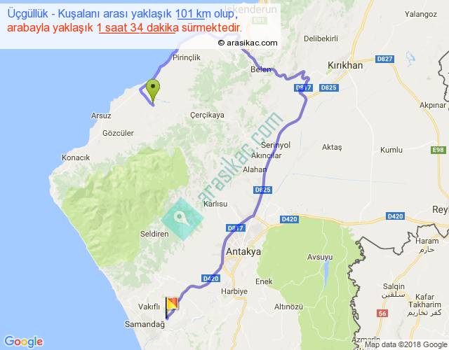 Üçgüllük - Kuşalanı arası yaklaşık olarak 90 km/h ile yukarıda belirtilen sürede olup, iki yerin kuş uçuşu uzaklığı (mesafesi) 38'dir. Yolculuk otobüsle 2 saat 2 dakika sürmektedir.