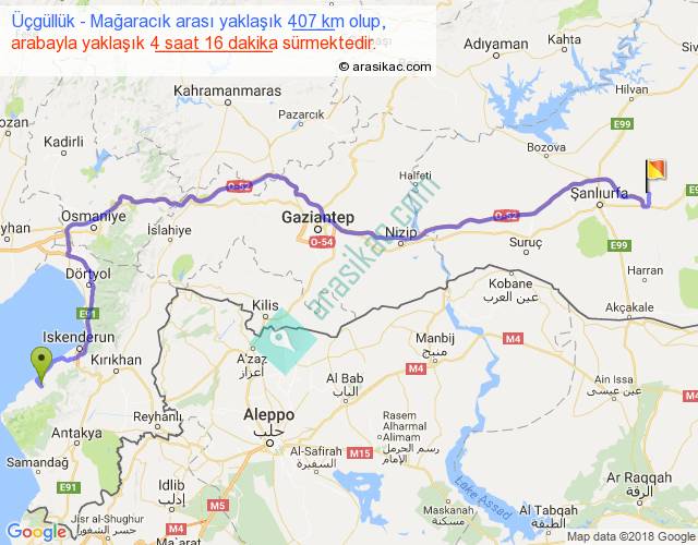 Üçgüllük - Mağaracık arası yaklaşık olarak 90 km/h ile yukarıda belirtilen sürede olup, iki yerin kuş uçuşu uzaklığı (mesafesi) 284'dir. Eğer belirtilen yerler arasında uçak seferi var ise bu süre uçakla 26 dakika'ya kadar düşebilir. Yolculuk otobüsle 5 saat 32 dakika sürmektedir.