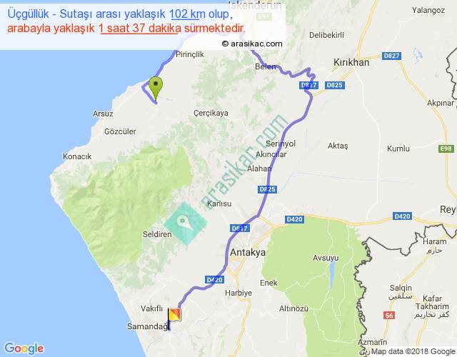 Üçgüllük - Sutaşı arası yaklaşık olarak 90 km/h ile yukarıda belirtilen sürede olup, iki yerin kuş uçuşu uzaklığı (mesafesi) 39'dir. Yolculuk otobüsle 2 saat 6 dakika sürmektedir.