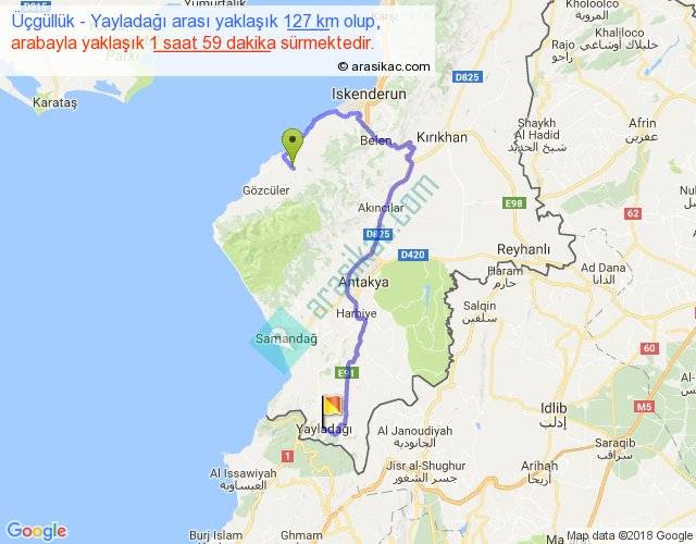 Üçgüllük - Yayladağı arası yaklaşık olarak 90 km/h ile yukarıda belirtilen sürede olup, iki yerin kuş uçuşu uzaklığı (mesafesi) 59'dir. Yolculuk otobüsle 2 saat 34 dakika sürmektedir.