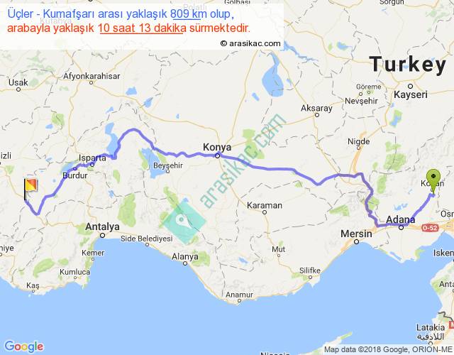 Üçler - Kumafşarı arası yaklaşık olarak 90 km/h ile yukarıda belirtilen sürede olup, iki yerin kuş uçuşu uzaklığı (mesafesi) 555'dir. Eğer belirtilen yerler arasında uçak seferi var ise bu süre uçakla 51 dakika'ya kadar düşebilir. Yolculuk otobüsle 13 saat 16 dakika sürmektedir.