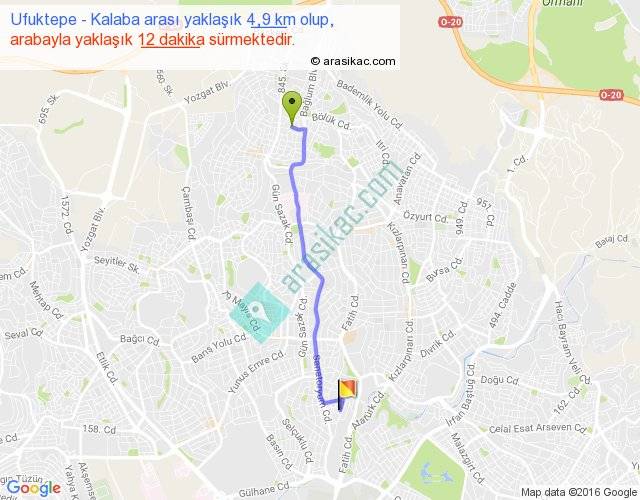 Ufuktepe - Kalaba arası yaklaşık olarak 90 km/h ile yukarıda belirtilen sürede olup, iki yerin kuş uçuşu uzaklığı (mesafesi) 4'dir. Yolculuk otobüsle 15 dakika sürmektedir.