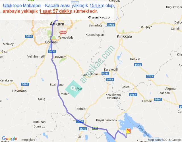 Ufuktepe Mahallesi - Kacarlı arası yaklaşık olarak 90 km/h ile yukarıda belirtilen sürede olup, iki yerin kuş uçuşu uzaklığı (mesafesi) 117'dir. Yolculuk otobüsle 2 saat 32 dakika sürmektedir.