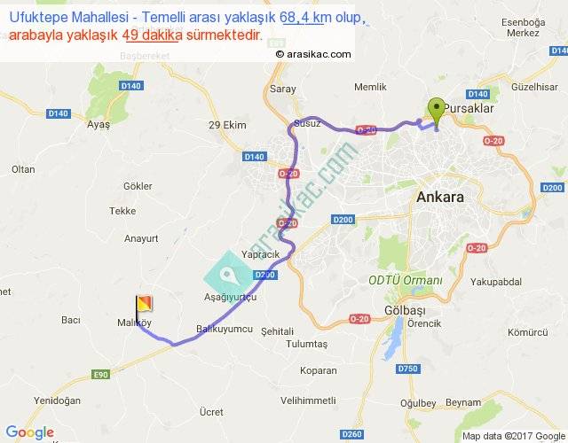 Ufuktepe Mahallesi - Temelli arası yaklaşık olarak 90 km/h ile yukarıda belirtilen sürede olup, iki yerin kuş uçuşu uzaklığı (mesafesi) 47'dir. Yolculuk otobüsle 1 saat 3 dakika sürmektedir.