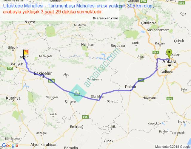 Ufuktepe Mahallesi - Türkmenbaşı Mahallesi arası yaklaşık olarak 90 km/h ile yukarıda belirtilen sürede olup, iki yerin kuş uçuşu uzaklığı (mesafesi) 227'dir. Yolculuk otobüsle 4 saat 31 dakika sürmektedir.