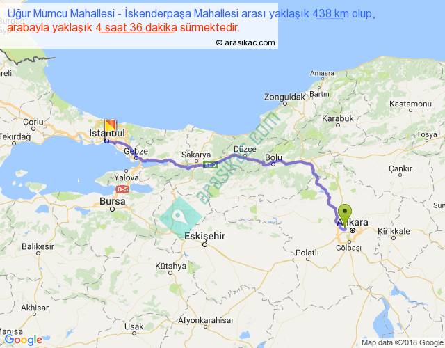 Uğur Mumcu Mahallesi - İskenderpaşa Mahallesi arası yaklaşık olarak 90 km/h ile yukarıda belirtilen sürede olup, iki yerin kuş uçuşu uzaklığı (mesafesi) 340'dir. Eğer belirtilen yerler arasında uçak seferi var ise bu süre uçakla 31 dakika'ya kadar düşebilir. Yolculuk otobüsle 5 saat 58 dakika sürmektedir.