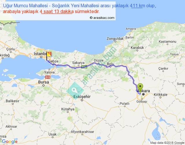 Uğur Mumcu Mahallesi - Soğanlık Yeni Mahallesi arası yaklaşık olarak 90 km/h ile yukarıda belirtilen sürede olup, iki yerin kuş uçuşu uzaklığı (mesafesi) 317'dir. Eğer belirtilen yerler arasında uçak seferi var ise bu süre uçakla 29 dakika'ya kadar düşebilir. Yolculuk otobüsle 5 saat 28 dakika sürmektedir.