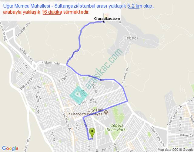 Uğur Mumcu Mahallesi - Sultangazi İstanbul arası yaklaşık olarak 90 km/h ile yukarıda belirtilen sürede olup, iki yerin kuş uçuşu uzaklığı (mesafesi) 3'dir. Yolculuk otobüsle 20 dakika sürmektedir.