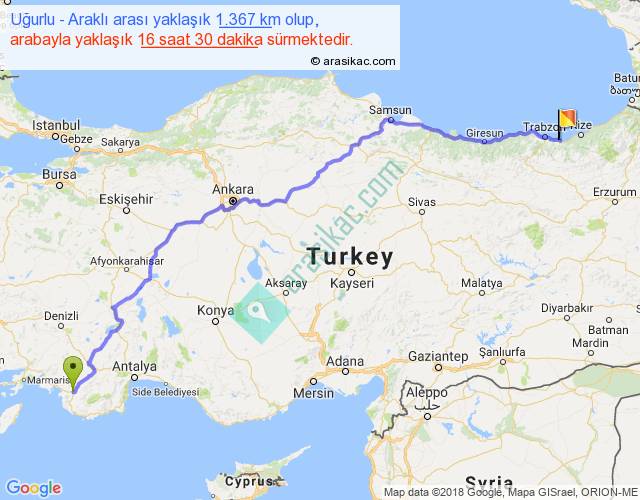 Uğurlu - Araklı arası yaklaşık olarak 90 km/h ile yukarıda belirtilen sürede olup, iki yerin kuş uçuşu uzaklığı (mesafesi) 1036'dir. Eğer belirtilen yerler arasında uçak seferi var ise bu süre uçakla 1 saat 35 dakika'ya kadar düşebilir. Yolculuk otobüsle 21 saat 27 dakika sürmektedir.