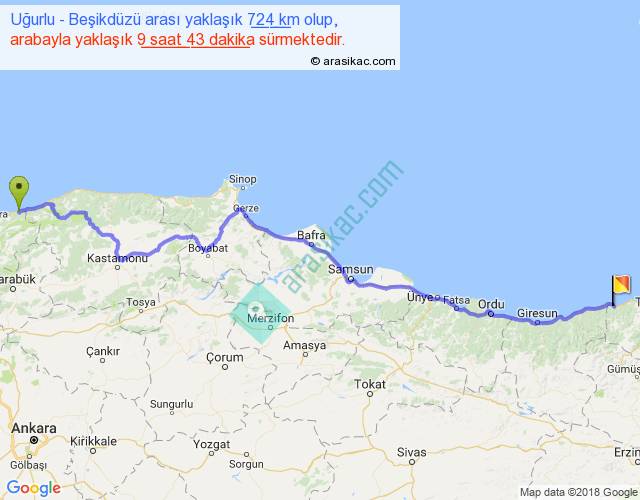 Uğurlu - Beşikdüzü arası yaklaşık olarak 90 km/h ile yukarıda belirtilen sürede olup, iki yerin kuş uçuşu uzaklığı (mesafesi) 548'dir. Eğer belirtilen yerler arasında uçak seferi var ise bu süre uçakla 50 dakika'ya kadar düşebilir. Yolculuk otobüsle 12 saat 37 dakika sürmektedir.