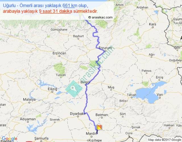 Uğurlu - Ömerli arası yaklaşık olarak 90 km/h ile yukarıda belirtilen sürede olup, iki yerin kuş uçuşu uzaklığı (mesafesi) 385'dir. Eğer belirtilen yerler arasında uçak seferi var ise bu süre uçakla 35 dakika'ya kadar düşebilir. Yolculuk otobüsle 12 saat 22 dakika sürmektedir.