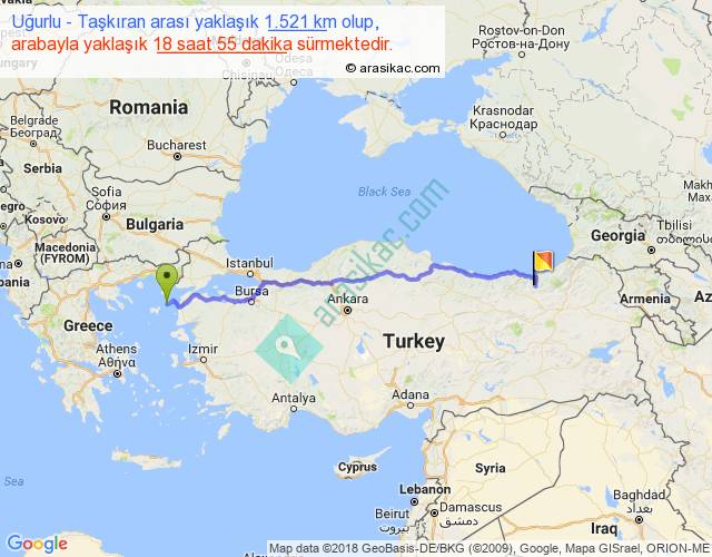Uğurlu - Taşkıran arası yaklaşık olarak 90 km/h ile yukarıda belirtilen sürede olup, iki yerin kuş uçuşu uzaklığı (mesafesi) 1225'dir. Eğer belirtilen yerler arasında uçak seferi var ise bu süre uçakla 1 saat 53 dakika'ya kadar düşebilir. Yolculuk otobüsle 1 gün 0 saat sürmektedir.