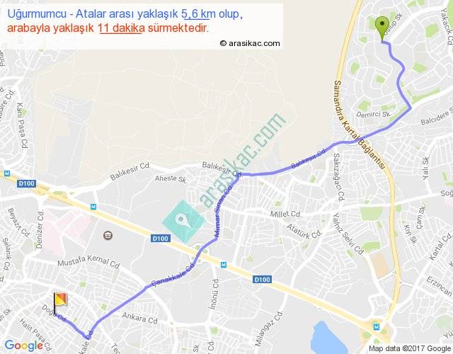 Uğurmumcu - Atalar arası yaklaşık olarak 90 km/h ile yukarıda belirtilen sürede olup, iki yerin kuş uçuşu uzaklığı (mesafesi) 4'dir. Yolculuk otobüsle 14 dakika sürmektedir.