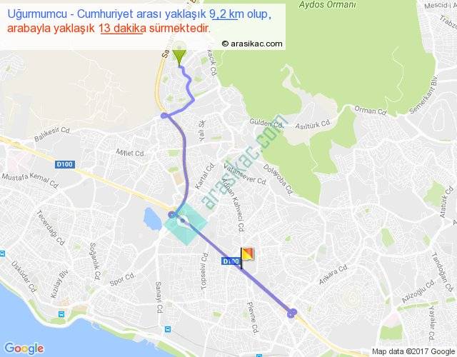 Uğurmumcu - Cumhuriyet arası yaklaşık olarak 90 km/h ile yukarıda belirtilen sürede olup, iki yerin kuş uçuşu uzaklığı (mesafesi) 4'dir. Yolculuk otobüsle 16 dakika sürmektedir.