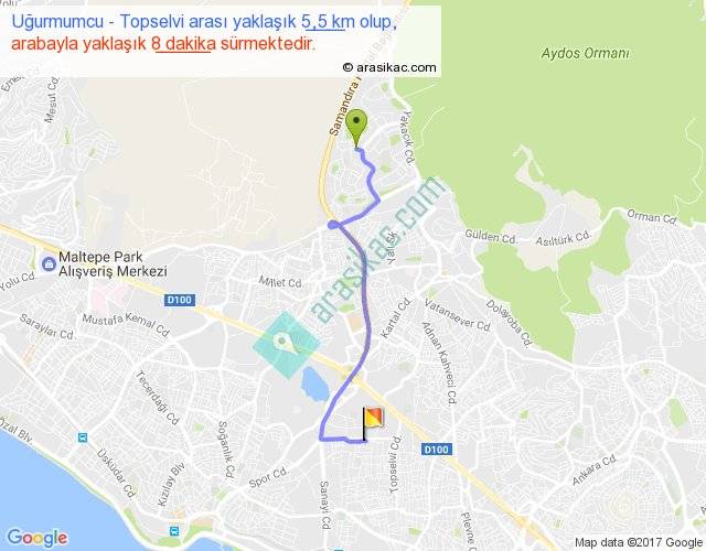 Uğurmumcu - Topselvi arası yaklaşık olarak 90 km/h ile yukarıda belirtilen sürede olup, iki yerin kuş uçuşu uzaklığı (mesafesi) 4'dir. Yolculuk otobüsle 10 dakika sürmektedir.