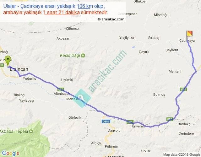 Ulalar - Çadırkaya arası yaklaşık olarak 90 km/h ile yukarıda belirtilen sürede olup, iki yerin kuş uçuşu uzaklığı (mesafesi) 67'dir. Yolculuk otobüsle 1 saat 45 dakika sürmektedir.