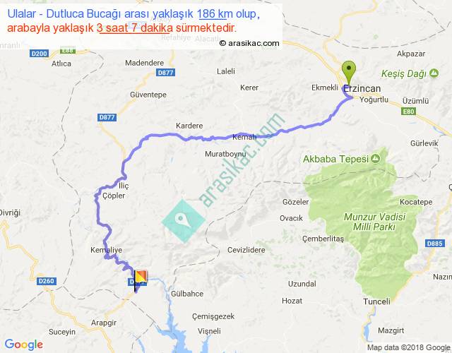 Ulalar - Dutluca Bucağı arası yaklaşık olarak 90 km/h ile yukarıda belirtilen sürede olup, iki yerin kuş uçuşu uzaklığı (mesafesi) 98'dir. Yolculuk otobüsle 4 saat 3 dakika sürmektedir.