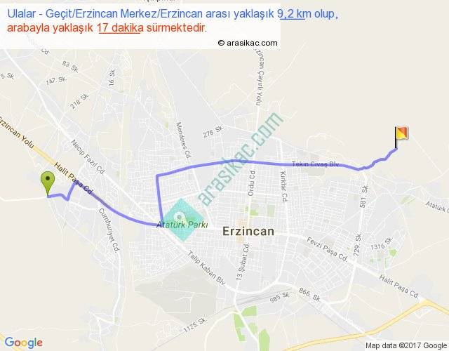 Ulalar - Geçit Erzincan Merkez Erzincan arası yaklaşık olarak 90 km/h ile yukarıda belirtilen sürede olup, iki yerin kuş uçuşu uzaklığı (mesafesi) 7'dir. Yolculuk otobüsle 22 dakika sürmektedir.