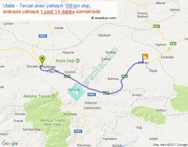 Ulalar - Tercan arası yaklaşık olarak 90 km/h ile yukarıda belirtilen sürede olup, iki yerin kuş uçuşu uzaklığı (mesafesi) 80'dir. Yolculuk otobüsle 1 saat 36 dakika sürmektedir.