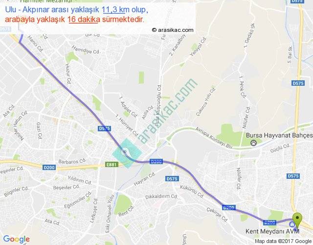 Ulu - Akpınar arası yaklaşık olarak 90 km/h ile yukarıda belirtilen sürede olup, iki yerin kuş uçuşu uzaklığı (mesafesi) 10'dir. Yolculuk otobüsle 20 dakika sürmektedir.