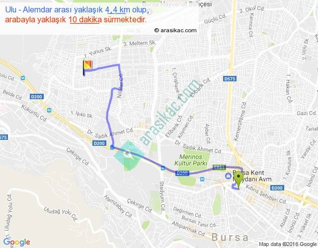 Ulu - Alemdar arası yaklaşık olarak 90 km/h ile yukarıda belirtilen sürede olup, iki yerin kuş uçuşu uzaklığı (mesafesi) 3'dir. Yolculuk otobüsle 13 dakika sürmektedir.