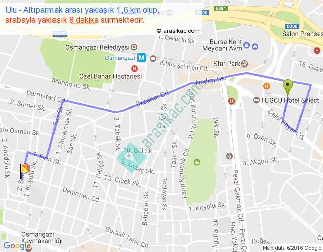 Ulu - Altıparmak arası yaklaşık olarak 90 km/h ile yukarıda belirtilen sürede olup, iki yerin kuş uçuşu uzaklığı (mesafesi) 1'dir. Yolculuk otobüsle 10 dakika sürmektedir.