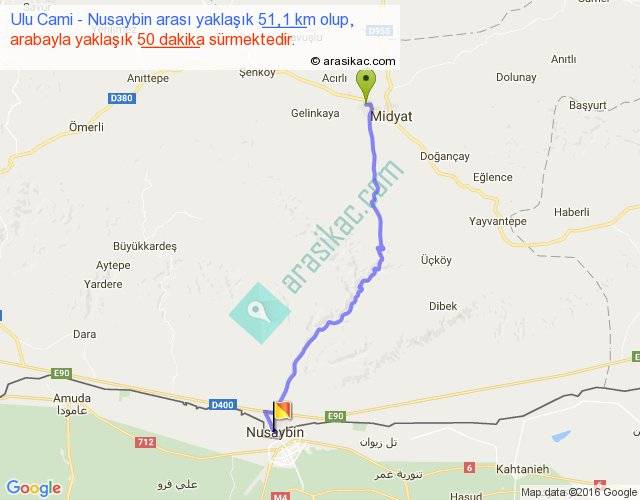 Ulu Cami - Nusaybin arası yaklaşık olarak 90 km/h ile yukarıda belirtilen sürede olup, iki yerin kuş uçuşu uzaklığı (mesafesi) 41'dir. Yolculuk otobüsle 1 saat 5 dakika sürmektedir.